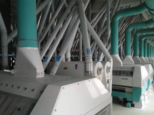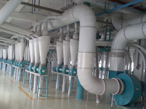500噸面粉加工成套設備,該工藝以小麥為原料,日處理小麥500噸,是一條自動生產線,清理、去石、打麥、除塵、著水、凈糧二次清理、輸送等工段。